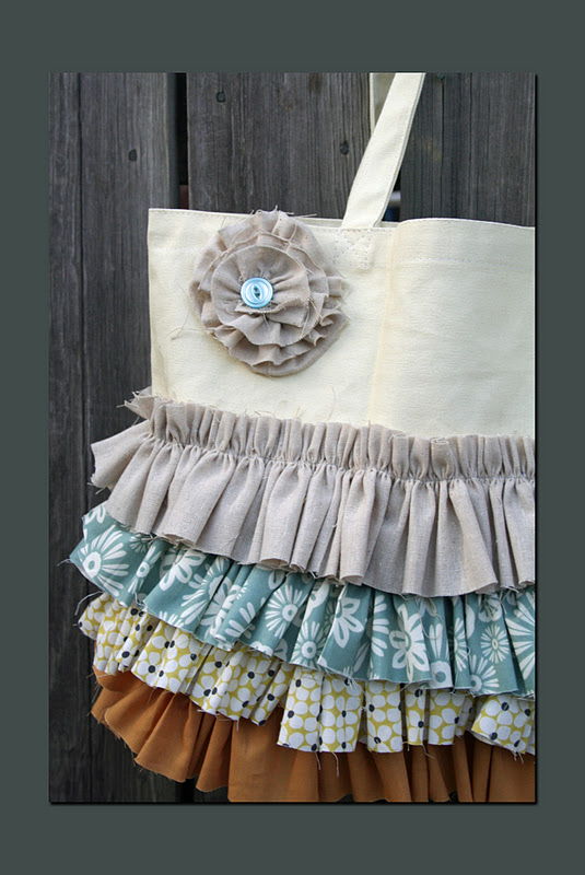 Then I put the flower on the top by making a long ruffle strip about 2 inches wide, and just curling it around and around to form it into a flower shape. Then I hand sewed the layers each time around with a couple stitches. Hot glued the button on the middle and hand sewed it to the bag.